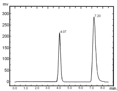 Figure 2. a. Chromatogram of nicotinic acid, eluting at 4.07 min and niacinamide, eluting at 7.20 min. with photolysis unit on. b. chromatogram of nicotinic acid and niacinamide with photolysis unit off.