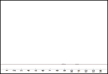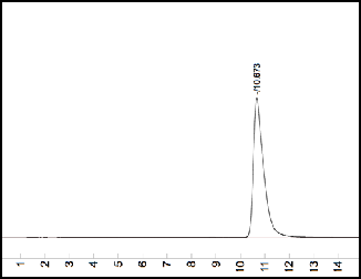 We compared 2 chromatograms: one with the UV lamp on (Fig. 3) and one with the lamp off (Fig. 4). Both were otherwise identical. The chromatogram with the light off had only small peaks at 8.79 and 10.71 minutes with integrated areas of 74.35 and 17.61 respectively. The chromatogram with UV light on in contrast had a very substantial peak at 10.67 min with an integrated area of 20595. Thus the 10.70 minute peak in the light off chromatogram (Fig. 4) has increased 1169 fold due to the photolysis as shown in the light on chromatogram (Fig. 3). We can estimate the limit of detection (LOD) considering that the noise level is circa .25 millivolt and the LOD should consequently be