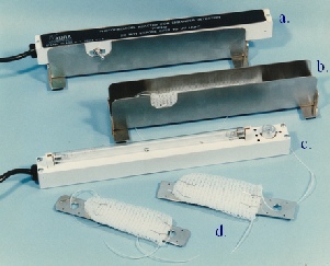 b. Stainless steel bottom casing with knitted reactor coil inside. c. Lamp holder