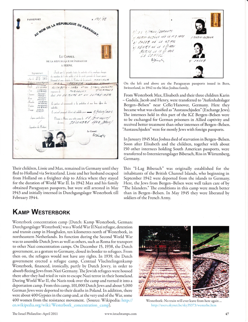 “The Fate of the Joshua Family in World War II” was written by Erik Lordahl and was first published in early 2011 in Norwegian War and post Journal No. 1/2011, pages 5-19, of which he is the editor. With his permission it was also published in the April 2011 issue of “the Israel Philatelist”, pages 46-51, using a slightly different layout. This copy of the Israel Philatelist publication also shows a photo of a Dutch National memorial at Westerbork. The memorial was designed by Ralph Prins who happens to be my second cousin once removed. His grandfather, Eliezer Liepman Philip Prins, was my great grandfather.