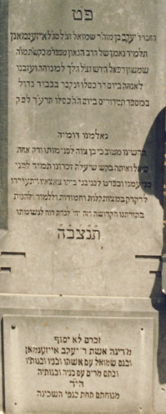 "Here is interred: The Chover Rav Yaakov son of Moreinu Harav Rav Shmuel, Zecher Zaddik Levrocho Segan Levi Eisenmann.