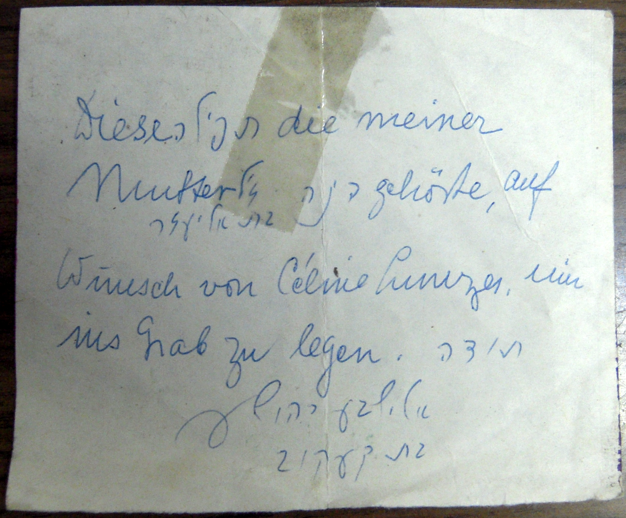 About twenty years ago I visited my mother in Jerusalem and she showed me a small well used sidur (9) that had belonged to her mother. Presumably it had been in grandmother Dientje’s suitcase when she died. On the inside cover was the inscription D.Eisenmann, Scheffelstr. 7 pt. My mother showed me a note that she had placed in the sidur. It read (Translated from German): “This Tefilo (10) belonged to my mother Dina bas Eliezer z’l. Celine Lunzer (11) requested that it be placed in my grave. Thank you. Elisheva Yehoshua bas Yacov.”